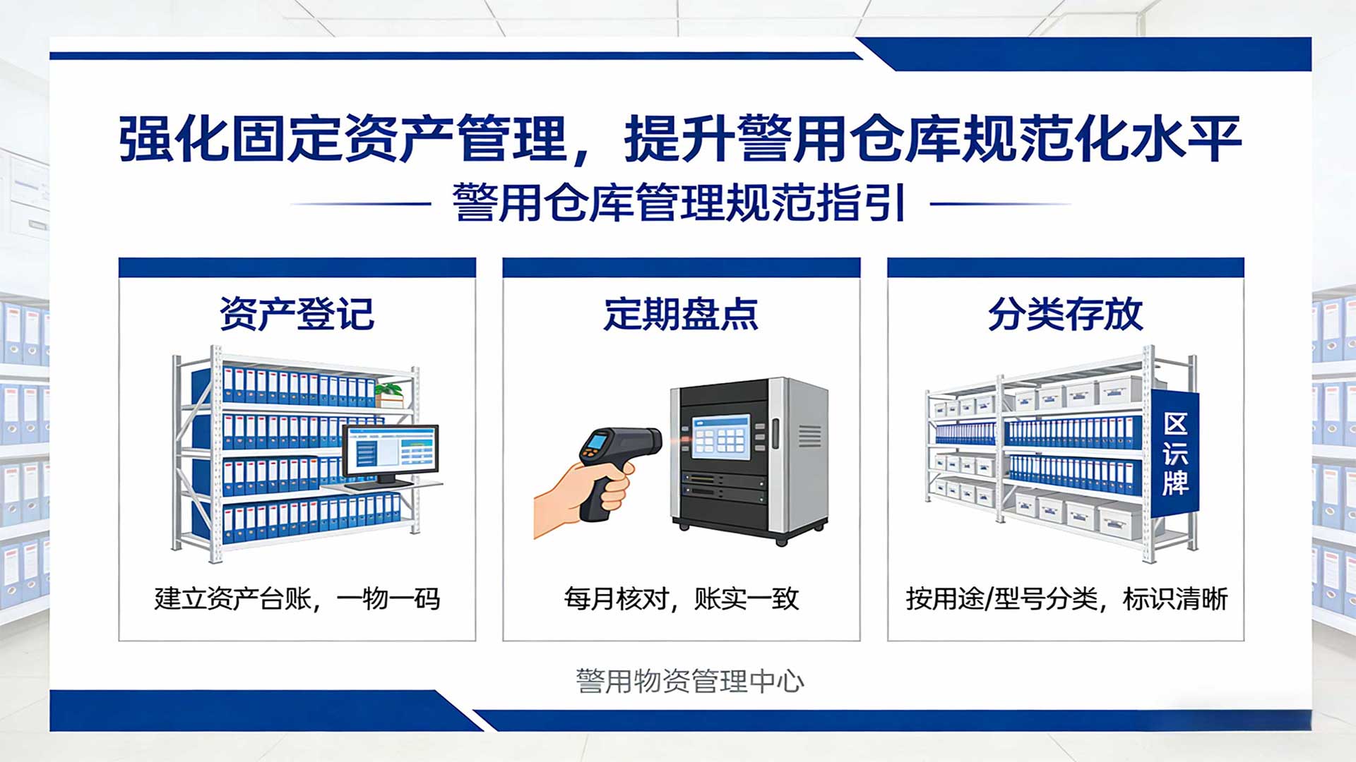 升级智能化管理体系,实现固定资产管控的 “精准化、自动化、智能化”。优化 “数字警保” 综合管理平台,新增资产优化配置模块,通过大数据分析各单位物资领用频次、库存周转效率,自动生成物资调配建议,减少闲置资产,提升库存周转率 25% 以上;增设智能预警功能,对库存低于安全阈值、临近质保期、超期未归还的物资自动推送预警信息,提醒管理人员及时处置。扩大智能设备应用范围,在仓库关键区域安装 AI 视频监控,自动识别违规堆放、未按规定佩戴防护装备等行为并实时告警;为高价值装备加装 GPS 定位模块,实现室外流转全程追踪;引入智能仓储机器人,负责物资的出入库搬运、货架补货等工作,降低人工劳动强度,提升仓储作业效率。