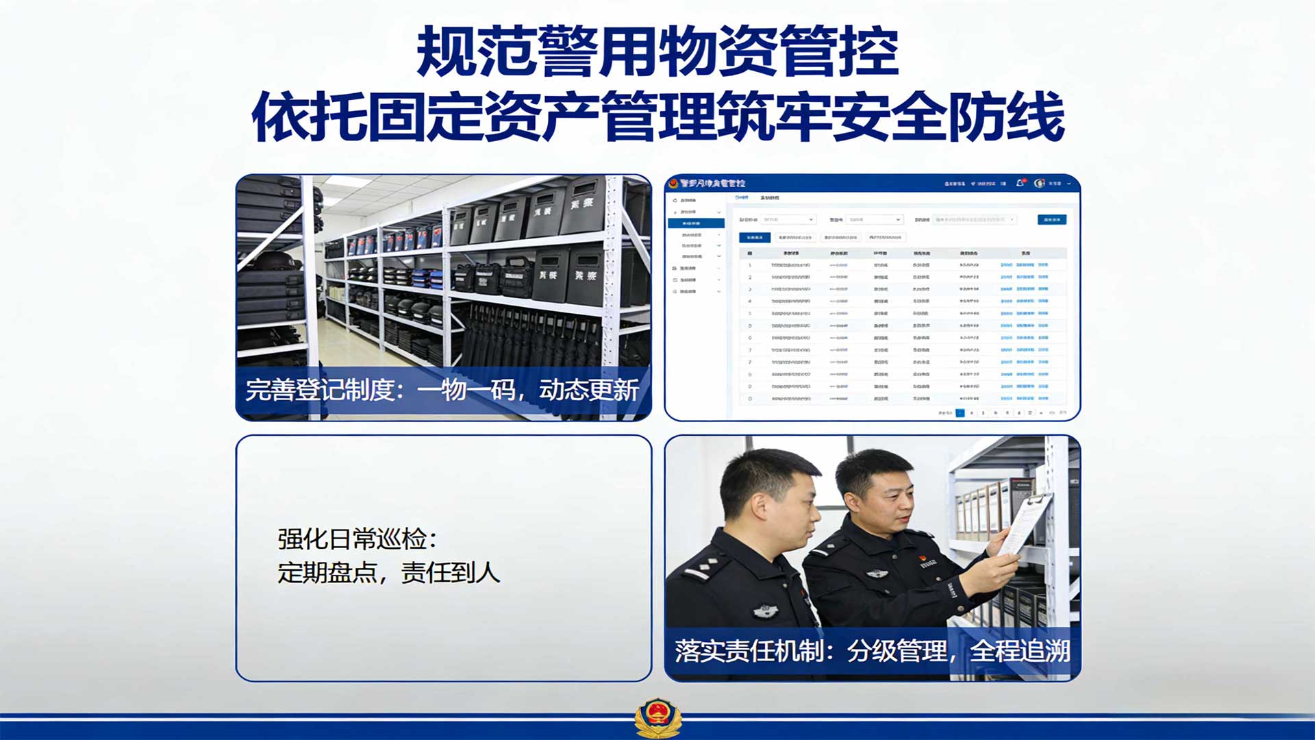 以全要素建档为核心,构建 “一物一码、一码全联” 的固定资产精细化台账体系。突破传统台账仅记录基础信息的局限,为每类警用物资建立包含 “基础属性 + 动态轨迹 + 状态评估” 的三维档案:基础属性涵盖名称、规格、采购金额、生产日期、质保期限等 12 项核心信息;动态轨迹实时更新入库验收、领用归还、维修保养、调拨流转等全流程记录;状态评估定期标注物资完好率、性能衰减程度、预计报废时间等关键数据。依托 “数字警保” 平台建立电子台账与实物标签的双向绑定机制,标签采用 “二维码 + RFID 芯片” 双标识,扫码即可查看完整档案,实现固定资产从采购入库到报废销毁的全生命周期可追溯、可核查,彻底解决 “底数不清、去向不明” 问题。