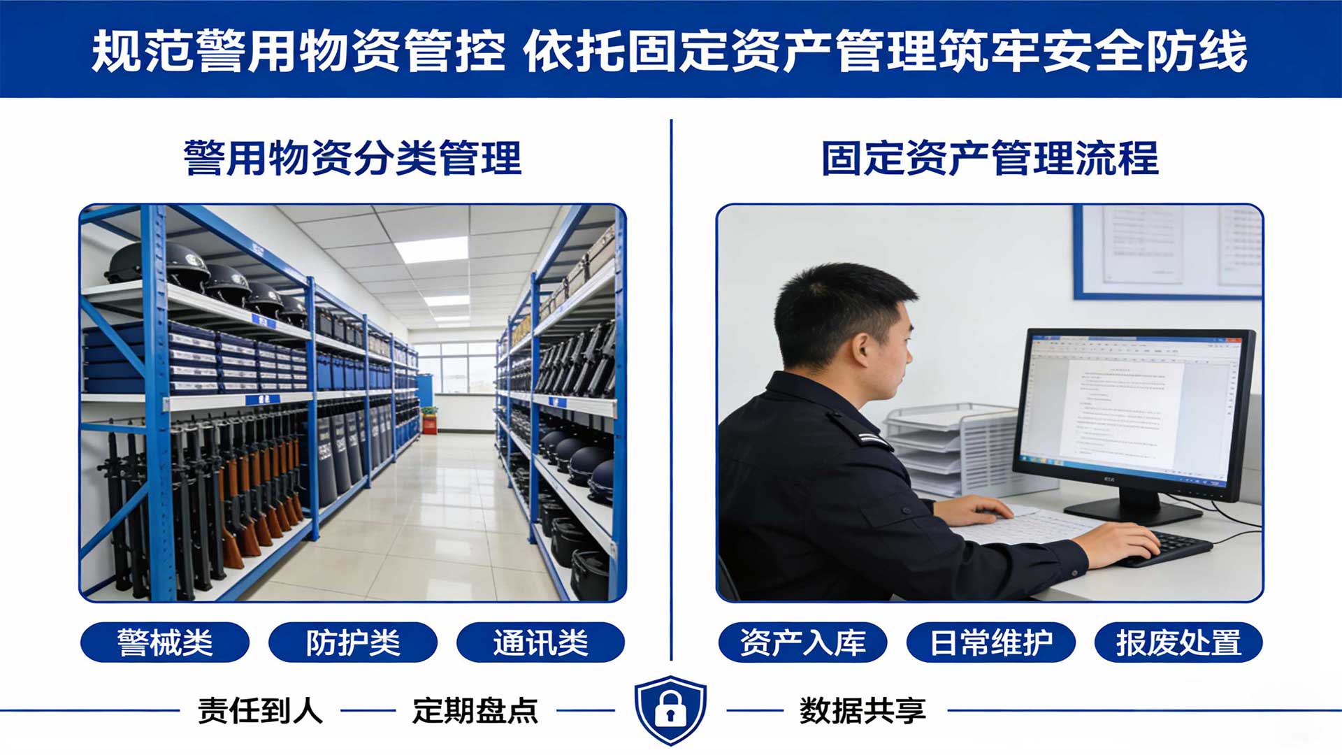 以流程优化为抓手,推动警用仓库管理从 “合规化” 向 “高效化” 升级。在入库环节,推行 “前置核验 + 智能分拣” 模式,采购物资到库前,提前通过系统上传质检报告、规格参数等信息,仓库管理人员线上预审;到库后利用智能分拣设备快速分类,结合 RFID 批量扫描录入系统,入库效率提升 40% 以上。在领用环节,优化 “需求申报 - 审批 - 领用” 流程,基层单位通过手机端提交领用申请,系统根据库存情况自动初审,紧急任务开通 “绿色通道”,审批时限从 24 小时压缩至 4 小时内;推行 “定额领用 + 循环使用” 机制,对防护装备、办公耗材等常规物资设定单位人均领用标准,避免浪费,同时建立废旧物资回收台账,对可维修、可复用的物资统一处置,提升资产利用率。在盘点环节,采用 “定期全面盘 + 动态重点盘” 结合模式,每半年开展全库无死角盘点,每月对高危物资、高价值装备进行专项盘点,借助智能盘点设备实现 “秒级核对”,盘点误差率控制在 0.5% 以内。